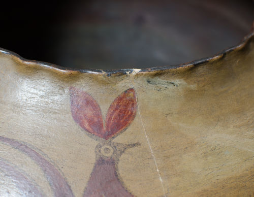 The broken fragments along the rim, and the hairline crack were treated with a reversible fill applied to the areas of loss. Retouching of the fill material was carried out to make the repair unnoticeable upon close viewing.